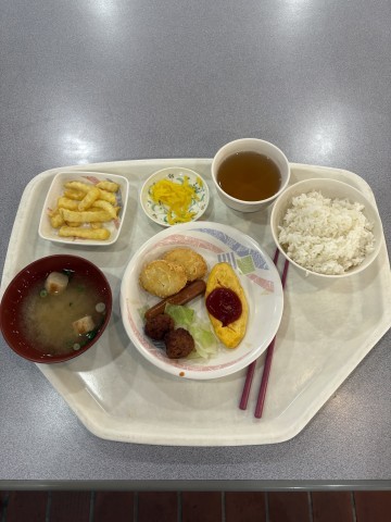 メニューは、プレーンオムレツ、ミートボール、フライドポテト、ウィンナーです。