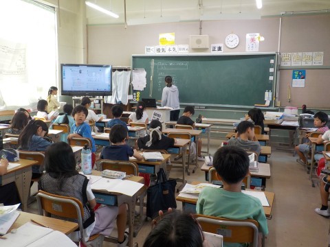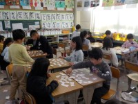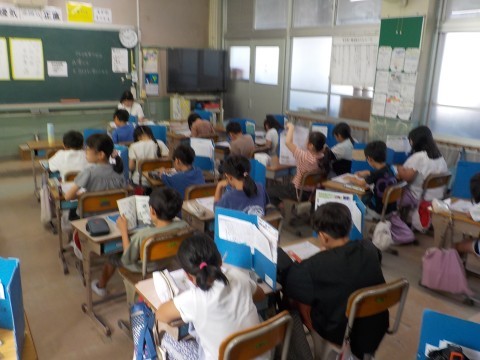 算数は小数の学習をしていました。0.7は0.1がいくつ分など一つひとつ確認しながら学習しています。隣のクラスではテストをしていました。