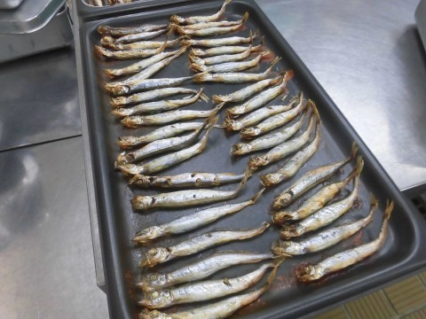 今日は,1・2年生には1尾,3~6年生には2尾のししゃもがでました。調理員さんが1尾ずつ,丁寧にいれてくださいました。
