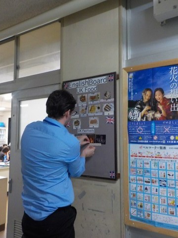 NSとして外国語を教えてくれている先生が理科室前の廊下にある掲示板でEnglish Boradを作ってくれました。出身国であるイギリスの食べ物やお祭りなどを写真にして紹介してくれています。