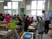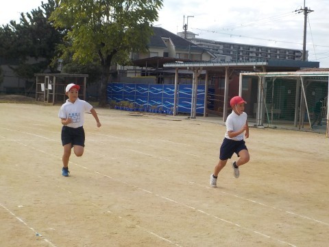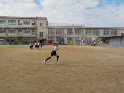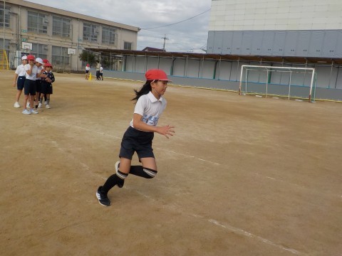 体育は50mのタイムを計測していました。待っている間には円を早く走る練習をしていました。みんな一生懸命手を振って本気で走っています。
