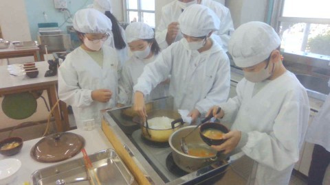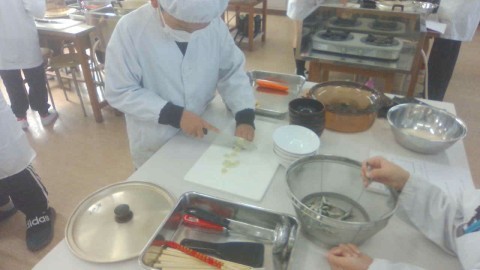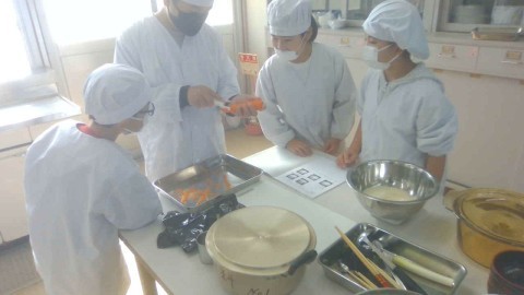 野菜を洗ったり,切ったり,お米や水の量をはかったり,班で協力して「ごはん・みそ汁」を作りました。