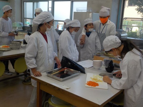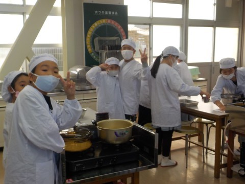 家庭科は調理実習をしていました。味噌汁とご飯を作っていました。食材を切ったり,出汁をとったり,ご飯の水の量をはかるなど協力してい取り組んでいました。作った後はみんなで食べていました。