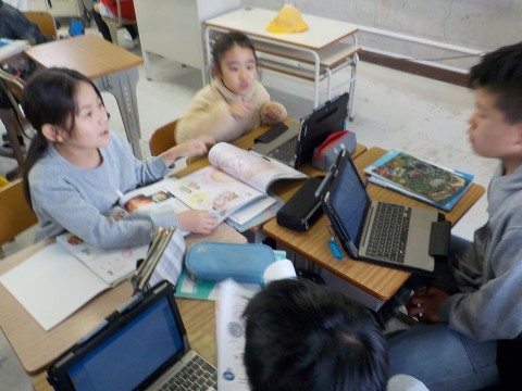 理科はヒトの誕生ということで,人間がどのようにうまれるのか教科書などを基にグループでまとめていました。それぞれの役割分担もしながら学習を進めていました。