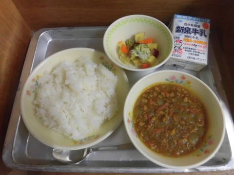 ごはん キーマカレーライス コロコロサラダ 牛乳