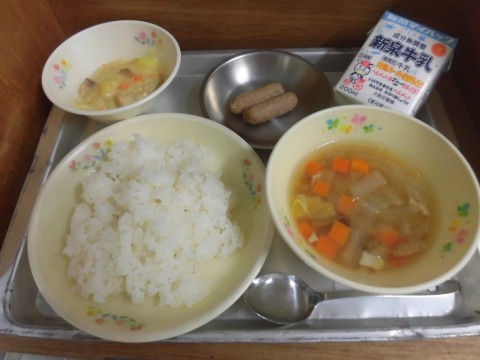 ごはん コンソメスープ 焼きウインナー かけたらクリームドリア 牛乳