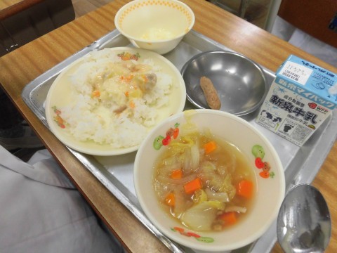 堺市産のはくさいがたくさん入った『コンソメスープ』、ごはんにかけて食べる『かけたらクリームドリア』でした。