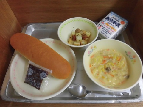 コッペパン クリーミーコーンの豆乳スープ ガーリックポテト チョコレートクリーム 牛乳