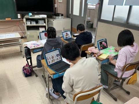 図工では、インターネットで調べてきた写真を見本しながら絵を描いています。絵の具や色鉛筆、クレパスなどを使いながら、丁寧に描いています。