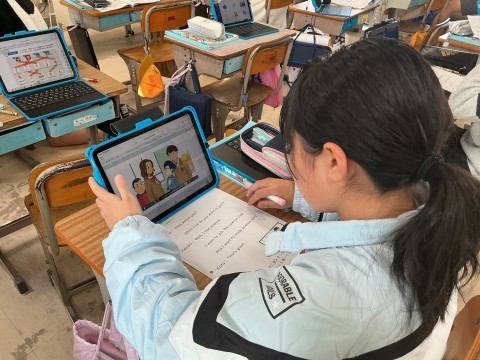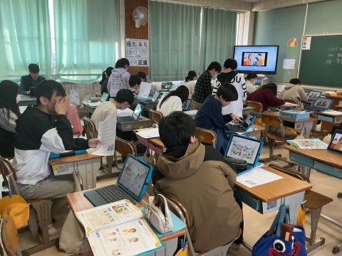 外国語の学習では、デジタル教科書を活用しながら、教科書のアニメーションに対して自分の声を入れていきながら練習しました。初めてのチャレンジですが、子どもたちが前向きに取り組んでいる様子が見られました。