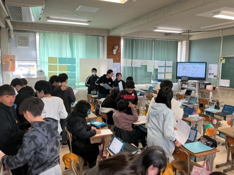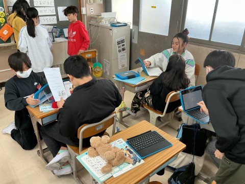 外国語の学習で、デジタル教科書を使いながら、本時で学習する会話のフレーズを繰り返し練習しました。練習をしたあとは、使えるようになったフレーズや単語などを使って、交流しました。