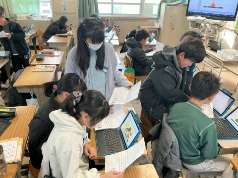 外国語の学習では繰り返し練習をしています。役割に分かれて話してみたり、一人で何度も練習するなど、子どもたちなりに学習を進めていました。練習したフレーズを使って、店員とお客に分かれて、注文しあいました。