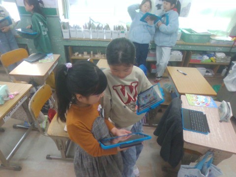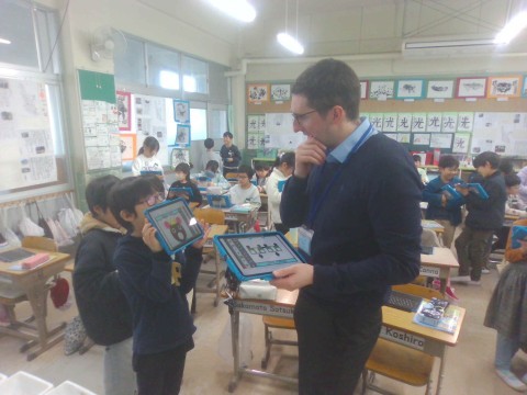 外国語の学習では、形を組み合わせて色々なものを作りました。そのあとは「Who is this?」というクイズを出したり、どんな形をいくつ使っているなど説明し合いました。