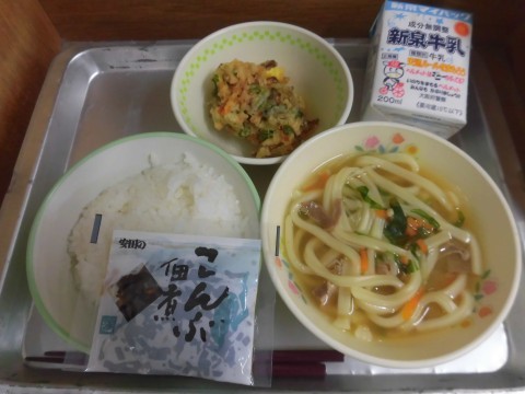 ごはん はりはりうどん かきあげ 昆布の佃煮 牛乳