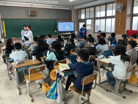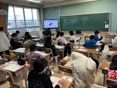 6年生の様子です。早速、算数の授業をしていました。線対象の学習に入っています。具体物を使って考えていました。