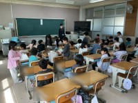 1年生がもうすぐはじまる給食に向けて、給食の用意の仕方やエプロン、盛り付けなどの説明を聞いていました。