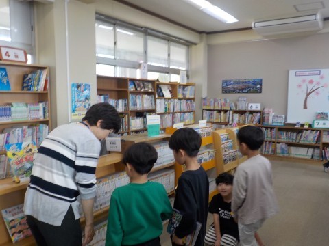 図書の時間です。何を借りようかなと迷っている児童に図書館司書の先生が優しく声をかけてくれていました。借りたい本が見つかったかな?