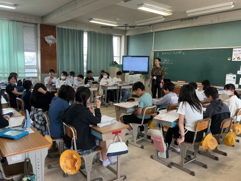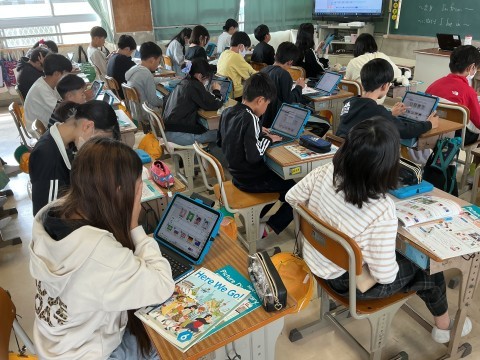 外国語は自己紹介に向けて出身地や住んでいる場所をふくめた「Who am I?」クイズを作っています。教科書を使った聞き取りの問題を解いている時には、紙の教科書を使っている子やiPadでデジタル教科書を使っている子など様々です。