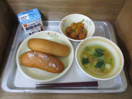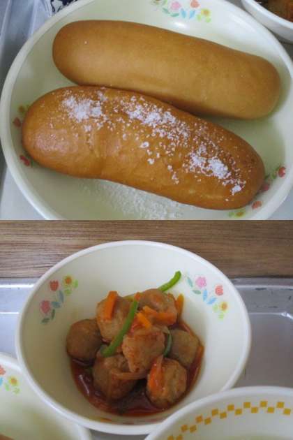 ミニパン 揚げパン 中華スープ ミートボールのケチャップ煮 牛乳