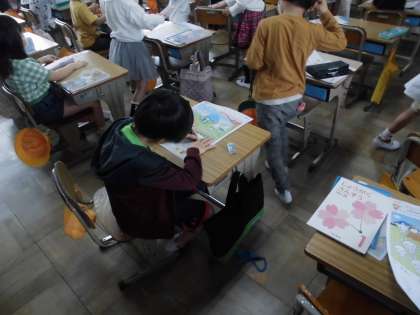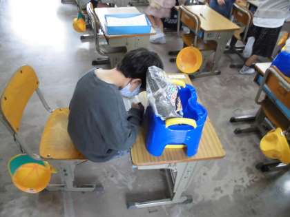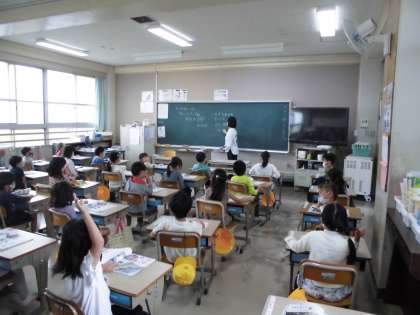 1組 あさがおの種の植え方についてみんなで確認しています。
