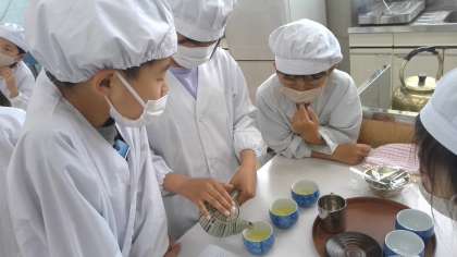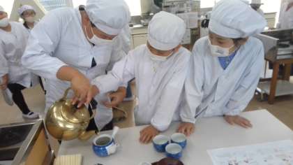 おいしいお茶の入れ方を学びました。班で協力して,実習スタートです。「すごくいい色してる!」と,完成に大満足のみんなでした。みんなのお茶もすごく美味しかったよ。ありがとう!!