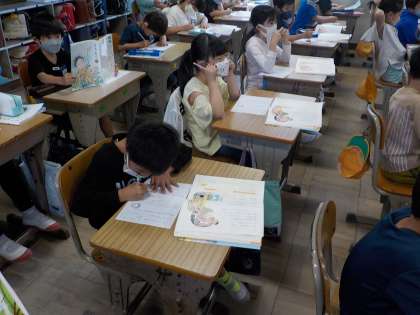 1組道徳:自分の学校のいいところを紹介する「ぼく」の気持ちを考えています。