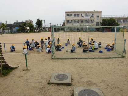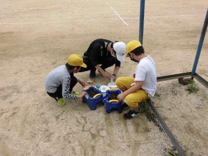 1年生 朝顔を植える準備をしています。今日は各自の植木鉢に土を作りました。
