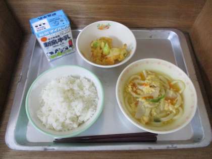 ごはん 親子うどん そら豆のかき揚げ 牛乳