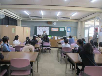 オリエンテーションで棚のどこにあるのか、クラスで何人か、本立てまで本を探しに行くことを実際にしてみました。さすが、高学年。さっと探していました。
