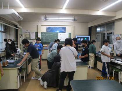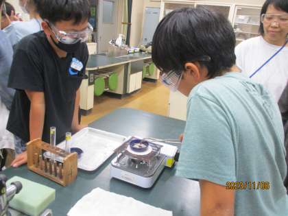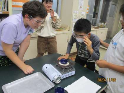 「塩酸に溶けて見えなくなった金属は、どうなったのだろうか」という問題に対し予想して、どうしてそう考えたのか理由も考え、それを証明する実験方法で確かめていきます。よく実験の意味を理解し、グループの友達を協力して、安全に実験を進めていました。実験中、匂いが発生するのですが、直截顔を近づけるのではなく、手で仰いで匂いをかぐことも気を付けてしていました。