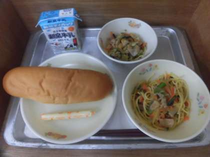 コッペパン じゃこと小松菜のスパゲティ 和風サラダ スティックチーズ 牛乳