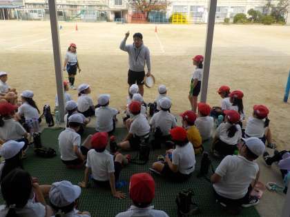 攻撃側と守備側にわかれて、タグを使った鬼遊びをしています。