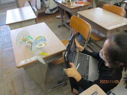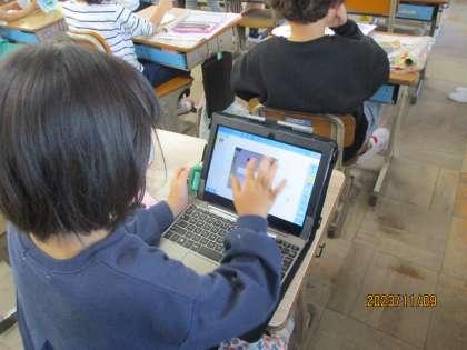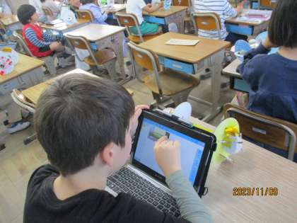 完成した工作作品の写真を撮って、そこにコメントを入れる四角の枠を作り、その中に工夫したところなどのコメントを書いていきます。自分の出来上がった作品の写真を撮ったとき、「うまく撮れた。やったー!」と思わずつぶやいている子もいました。発表ノートの貼りつけ、枠を作って、コメントを入れてという一連のタブレット学習がどの子も上手にできるようになってきました。