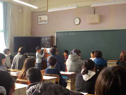 総合の発表です。防災について学習してきて、新しく知ったこと、考えたことなどをまとめて発表していました。ICTを活用したり、画用紙でまとめたり、自分たちで考えて伝えていました。