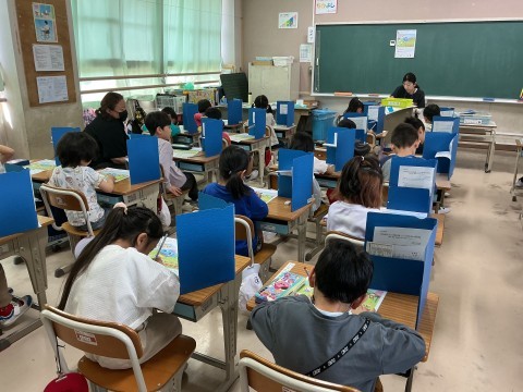 1年生の授業参観の様子です。初めての授業参観でした。たくさんのお家の方が来たので、緊張したかな?