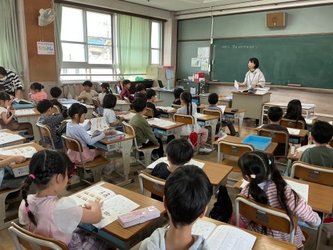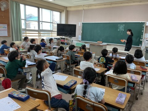 国語はひらがなの「え」の学習です。気をつけるポイントを確認していました。「点が小さい!」「とめてない」など先生が黒板に書く「え」を見ながら発言していました。