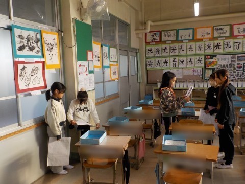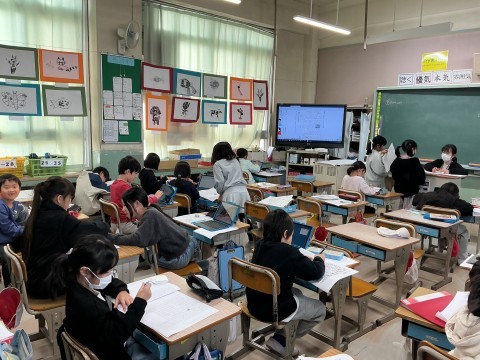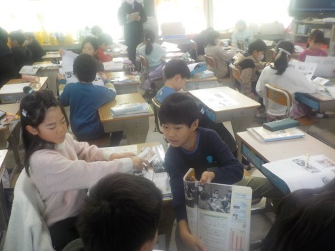 3年生は説明文をグループでまとめるようで、大きな模造紙に自分たちの書いた文を貼り付けていました。レイアウトを相談しながらまとめていきます。