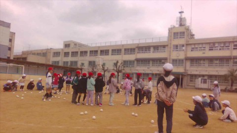 体育はキックべースをしていました。ボールを蹴ったり、キャッチして全員で「アウト」と言ったり楽しそうに取り組んでいました。