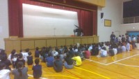 中学校の体育館を借りて,音楽の練習が始まりました。体育館では,音楽室での歌声の響...