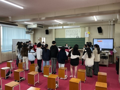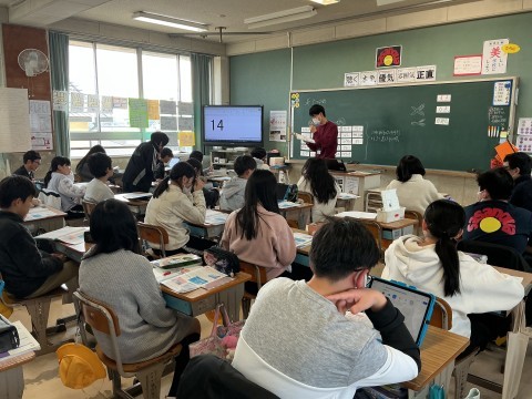外国語の学習では、将来つきたい職業やその理由について、動画を使いながら繰り返し練習しました。練習したあとはお互いのついきたい職業、まだ見つかっていないな子はやってみたいことについて交流しました。