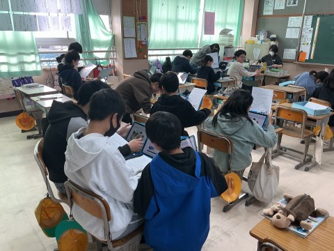 外国語の学習では将来なってみたい職業や興味のある職業について交流していきます。教科書の動画を基にアテレコしながら繰り返し、スピーチで使えるフレーズの練習をしました。何度も動画を確認しながら、言い方を確認する子、誰かといっしょに練習する子、練習できたから聞いてと前でチャレンジする子、まわりで練習している声でうまく録音できないから廊下に出てチャレンジしている子など自分なり学び方で取り組んでいます。