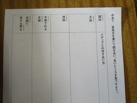 5年生の国語です。メディアとの付き合い方をテーマに意見文を書きます。意見文を書くには,明確な主張と事例や体験をもとにした説得力のある根拠が必要です。また,自分の立場だけに終始せず,考えられる反論を想定し,違った立場に立って物事を考える視野の広さも求められます。