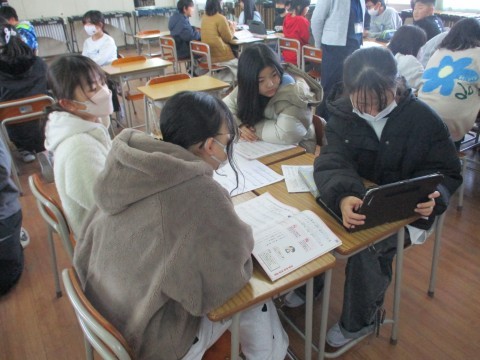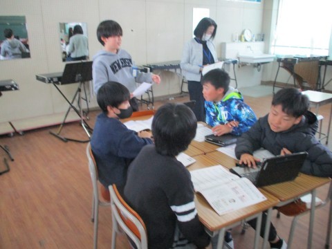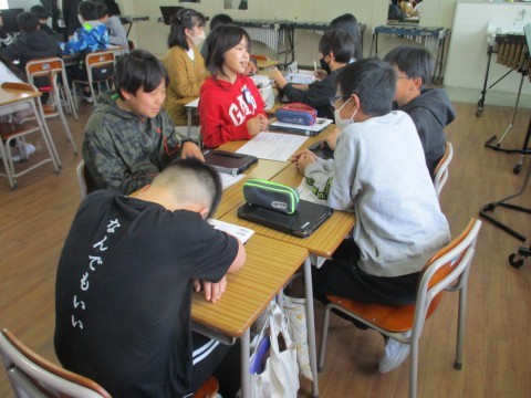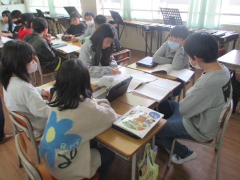 3組の音楽です。「それぞれの空」の曲にふさわしい歌い方を考える学習をしました。グループごとに曲や歌詞に着目して,歌い方について話し合っていました。