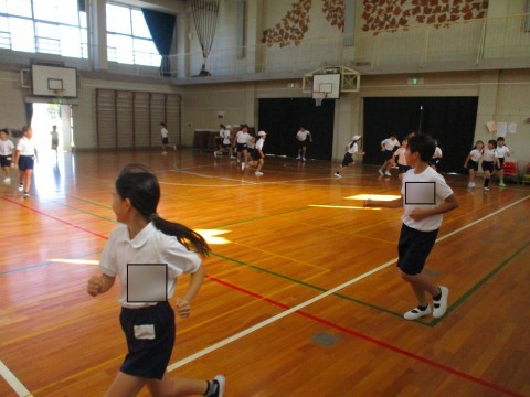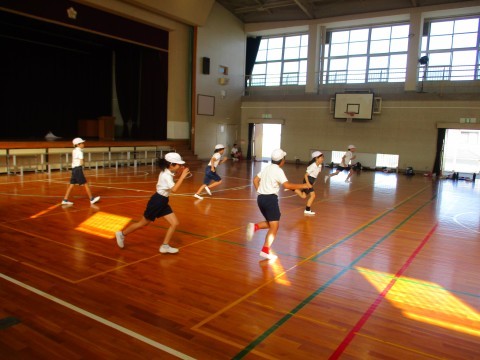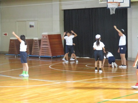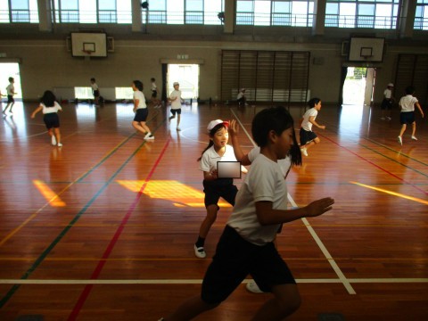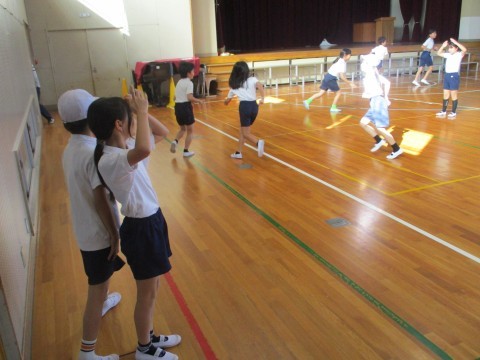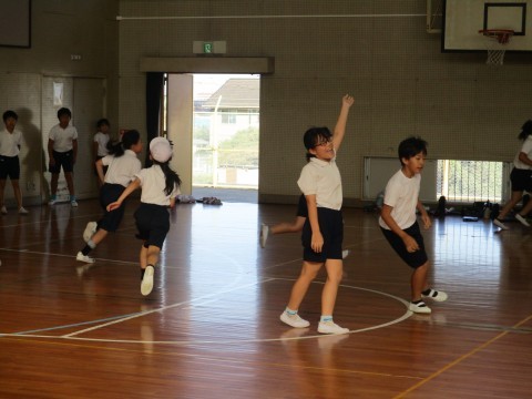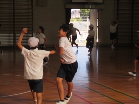 4年 バナナおにごっこ 公開日 2025/10/09 更新日 2025/10/09 4年生 1組の体育です。こどもたちは元気に体育館内を走り回っています。「バナナおにごっこ」をしているそうです。鬼にタッチされるとバナナになっちゃうんですが,もとに戻るためには友だちに2回タッチしてもらわなければいけません。あげた両腕をタッチしてもらうことで降ろせます。バナナの皮をむいているようすに似ているから,「バナナ鬼ごっこ」というみたいです。 +5