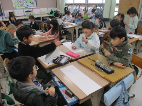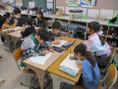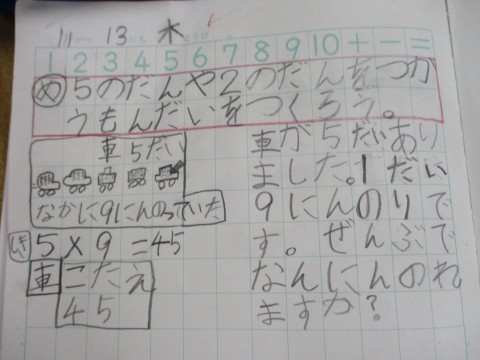 1組の算数「かけざん」の学習です。今日は,5のだんと2のだんを使った問題をグループで考えていました。かけ算の意味理解につながる活動ですね。自分たちがつくった問題を友だちに出すのが楽しみで待ちきれません!