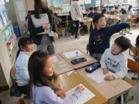 2組の国語「みきのたからもの」の学習です。物語のあらすじを書く活動をしていました。
