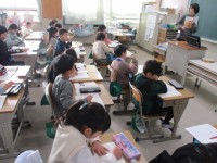 1組の国語「お話のさくしゃになろう」の学習です。教科書の2枚の挿絵の間に起こった出来事を想像し,お話をつくります。