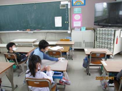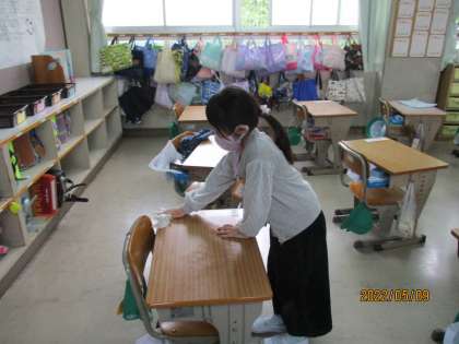 給食の時間です。当番の人が給食を取りに行っている間,机を一つ一つ拭いてくれています。