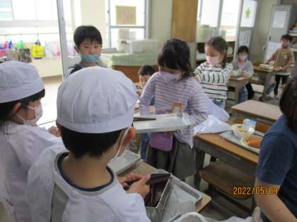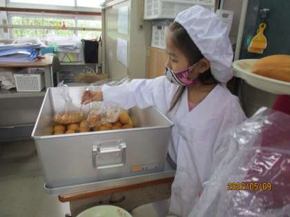 おはしと牛乳,小おかずにパン! 今日は揚げパンもありますよ。