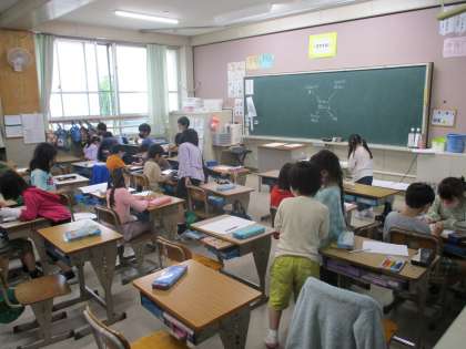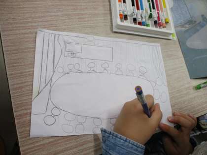 生活の授業で,1年生との校内案内にむけた各教室の看板を作っています。イラストや説明を工夫しています。